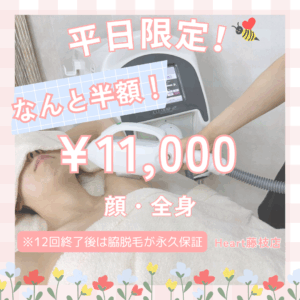 【平日限定半額】先着20名☆全身+お顔脱毛 通常¥22,000→¥11,000