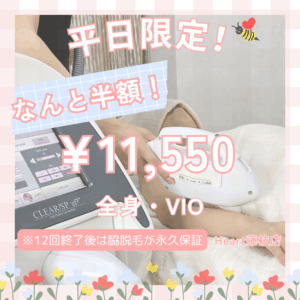 【平日限定半額】先着20名☆全身+VIO脱毛 1回¥11,550 ※女性限定