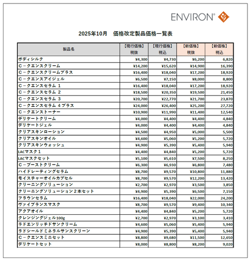 エンビロンホームケア製品につきましても10月1日より、一部製品が値上げされることとなりました。