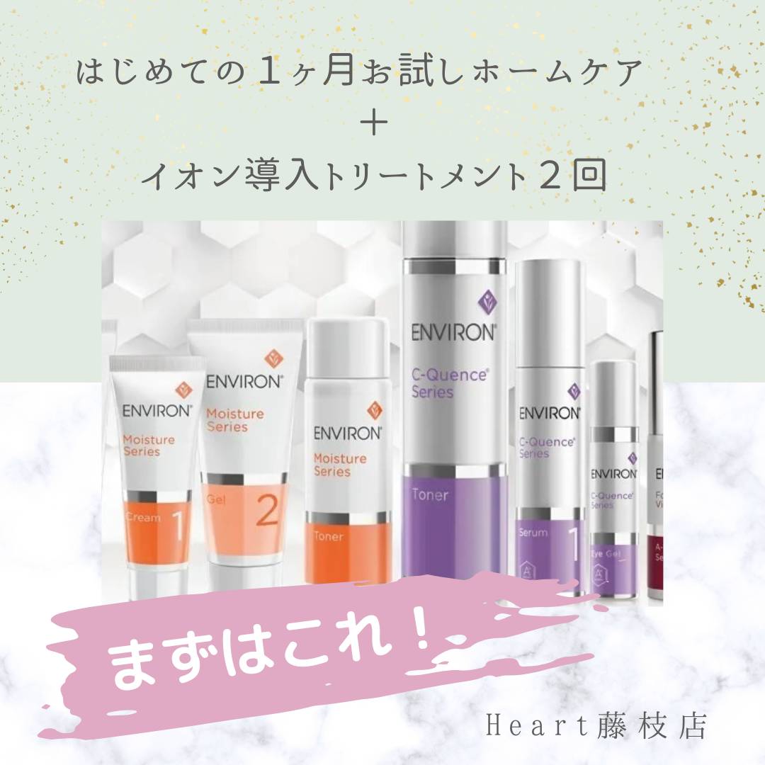 ホームケアスタートセット9,020円分とサロンケアが2回付いた1ヶ月お試しコース。イオン導入トリートメントはエンビロン初心者向けなので敏感肌の方にも◎初回はカウンセリングから行います☆